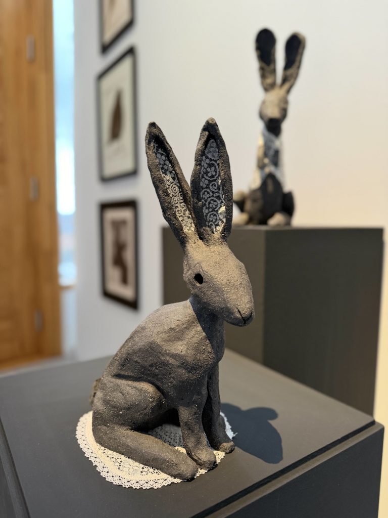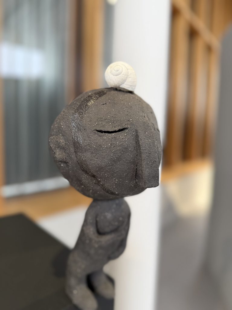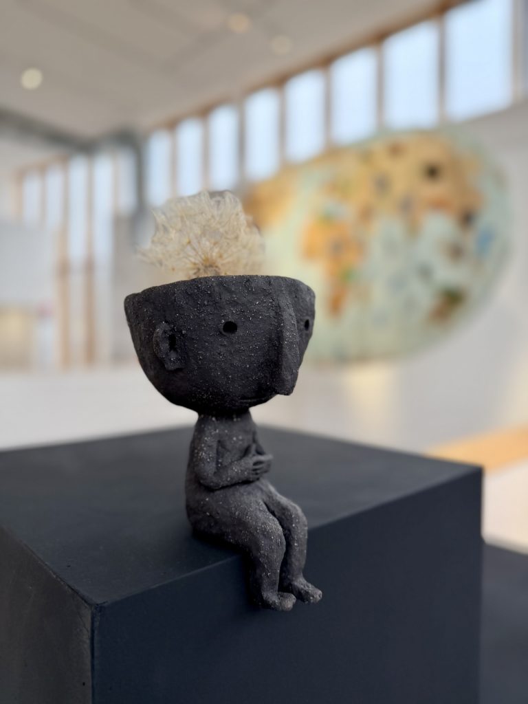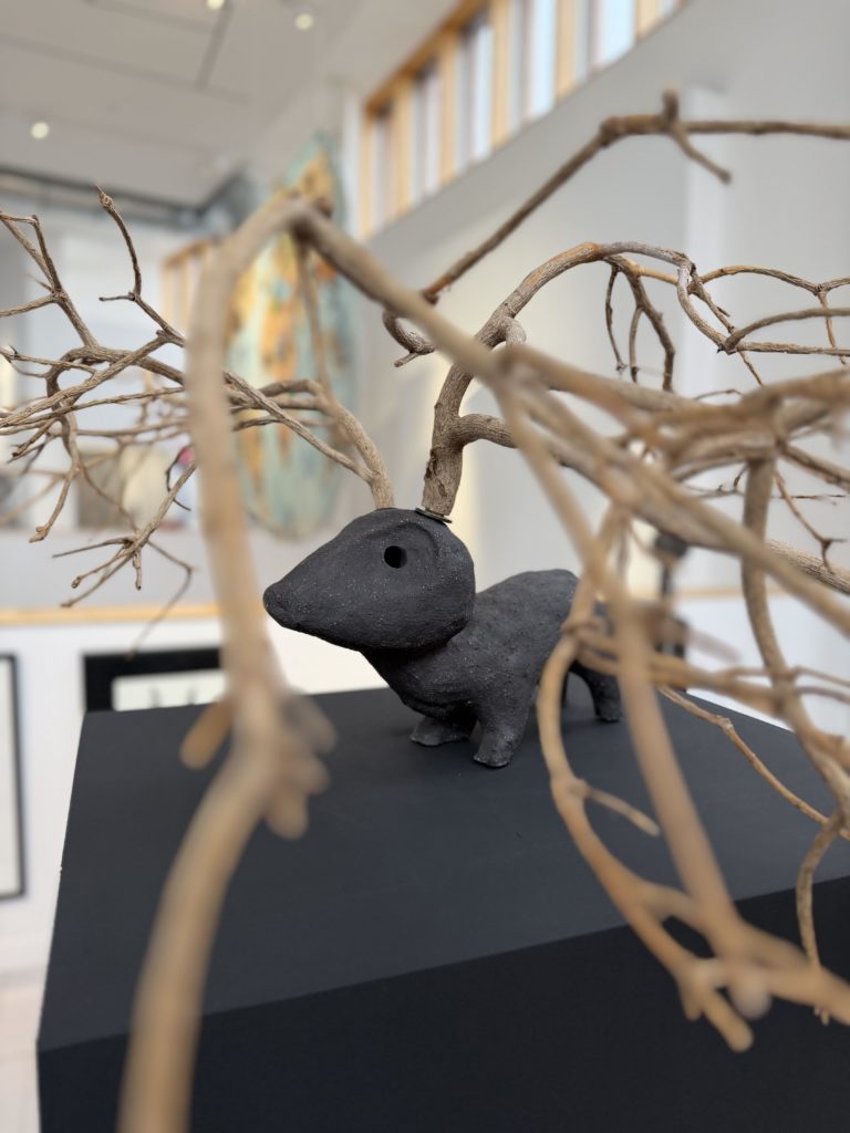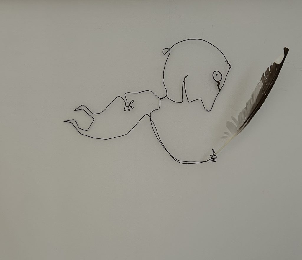 L’exposition rassemble plusieurs facettes de mon travail. On y trouvera d’abord une galerie de sculptures en fil de fer et en objets de récupération, inspirées des personnages de mes livres. On peut aussi découvrir des œuvres plus récentes : des personnages en céramique, des gravures, et un ensemble de panneaux qui retracent les étapes de création d’un livre, depuis les croquis préparatoires jusqu’à la version finale. L’idée est de montrer le chemin, le travail qu’on ne voit pas forcément derrière un album terminé.