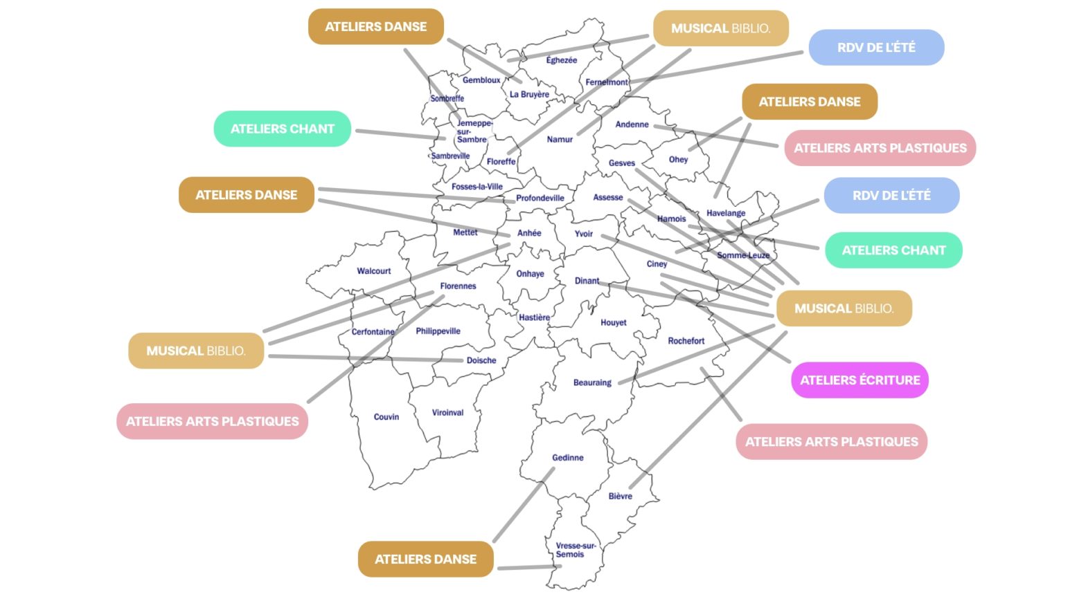 Nos actions touchent deux tiers des communes de la Province. Elles sont destinées principalement à l’inclusion des publics éloignés ou empêchés de l’offre culturelle et se déploient, en priorité, sur des zones blanches de la province de Namur. Voici une liste non exhaustive des activités que le Delta propose sur l’ensemble du territoire provincial :
